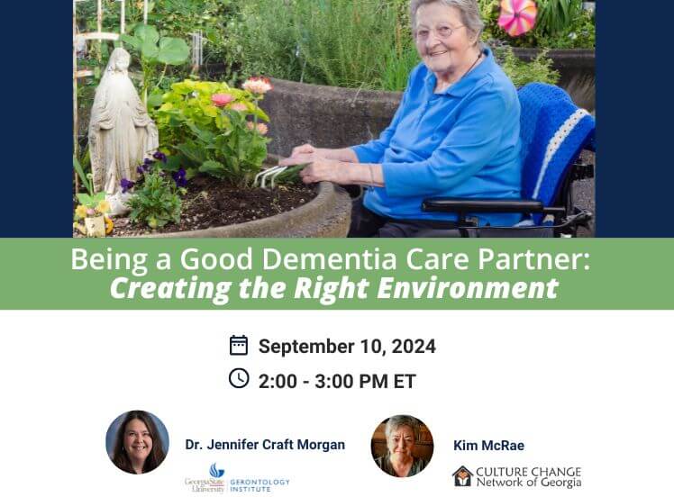 Join us for this motivating webinar series to find out what it takes to be a good care partner for people living with dementia. The four webinars will cover the vital importance of Knowing the Person, Engaging the Person, Focusing on Strengths, and Creating the Right Environment. In addition to discussing how to really get to know the person, we will also explore how to connect with them and meet them where they are, how to “be in the moment” with them, and how we can view all encounters as opportunities for meaningful engagement. You will leave each webinar with concrete knowledge about WHY each topic is important, as well as specific examples and resources for HOW to integrate these best/promising practices into your skill set as you strive to deliver person-centered dementia care and relationship-centered living at your organization or for your loved one.